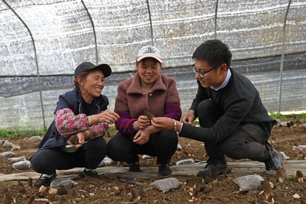 普向嵩(右)正指導(dǎo)村民采摘羊肚菌。趙勇攝
