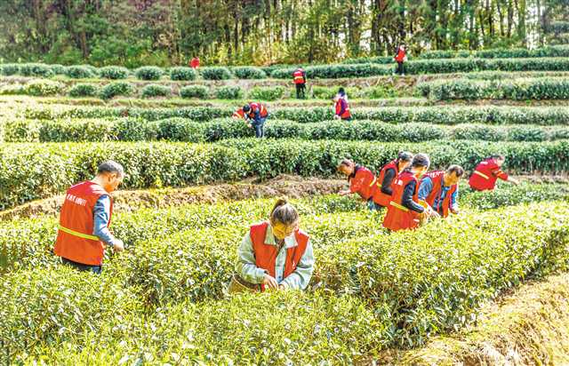 今年春茶開采后,氣溫陡然回升,南川區(qū)古道茶業(yè)2000余畝早春茶采摘缺少人手。冷水關(guān)鎮(zhèn)黨委政府獲悉后,發(fā)動機(jī)關(guān)、村社干部組成“幫幫客”志愿服務(wù)隊,走進(jìn)茶園幫助采摘明前茶,解了茶業(yè)企業(yè)的燃眉之急。特約攝影 瞿明斌/視覺重慶
