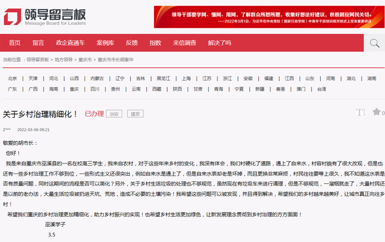 人民網(wǎng)重慶3月21日電 (陳琦)近日,一位重慶市巫溪縣高三學(xué)生通過(guò)人民網(wǎng)“領(lǐng)導(dǎo)留言板”給重慶市市長(zhǎng)胡衡華留言,他建議鄉(xiāng)村治理更加“精細(xì)化”,助力鄉(xiāng)村振興實(shí)現(xiàn)。