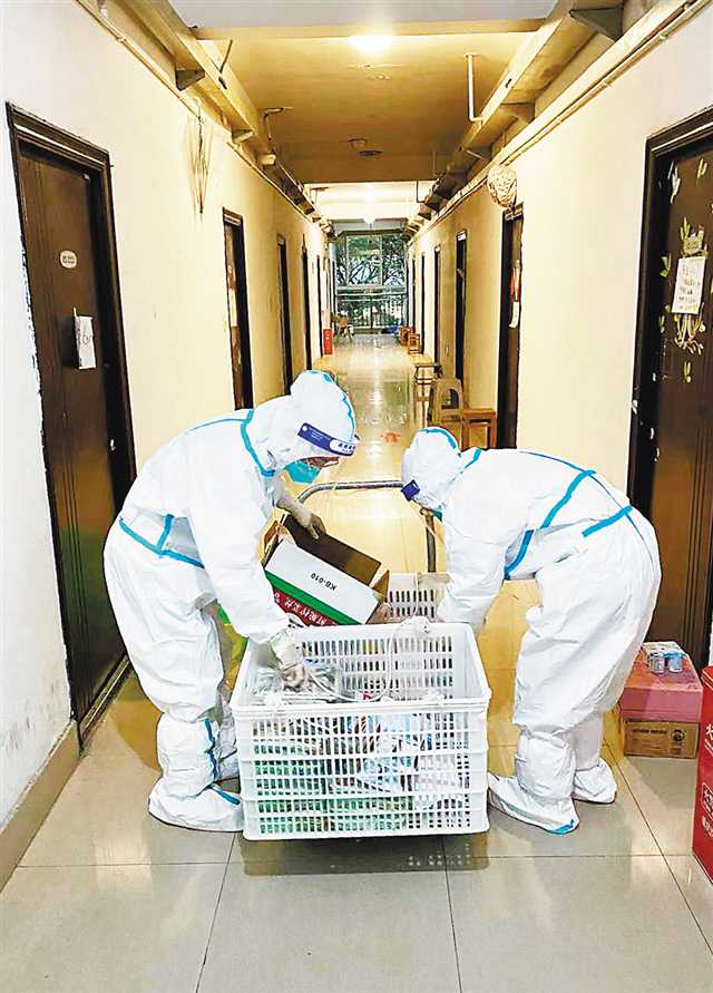 白天的志愿者們,是穿梭在梅苑2號(hào)和3號(hào)樓六層樓之間、300多個(gè)寢室的送餐、送物資“大白”。