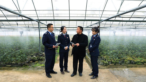 圖為秀山縣稅務局工作人員走進重慶渝林油茶研究中心有限公司育苗基地宣傳稅費優(yōu)惠政策。何川攝