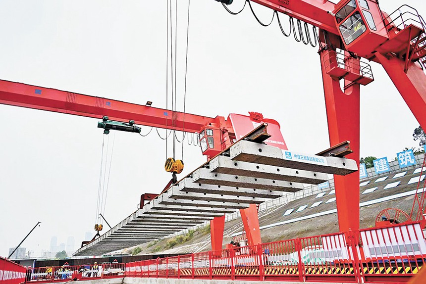 3月25日上午,渝北區(qū)中央公園在建的甘悅大道地鐵站附近,隨著鋪軌機(jī)將首根長25米、重14噸的軌排穩(wěn)穩(wěn)地落在軌道上,標(biāo)志著地鐵5號線北延伸段正式進(jìn)入鋪軌施工階段,全線有望年底建成通車。地鐵5號線北延伸段工程線路全長8.64公里,線路起點(diǎn)接5號線一期工程園博中心站,止于悅港北路站,設(shè)車站7座。文/記者楊永芹 圖/中建隧道提供