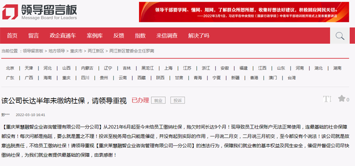 “感謝‘領(lǐng)導(dǎo)留言板’和兩江新區(qū)稅務(wù)局工作人員,上周稅務(wù)局一位老師給我來電話詳細(xì)溝通了辦理情況,公司負(fù)責(zé)人也承諾將盡快補(bǔ)繳社保!”該網(wǎng)友在電話中再三表示感謝。