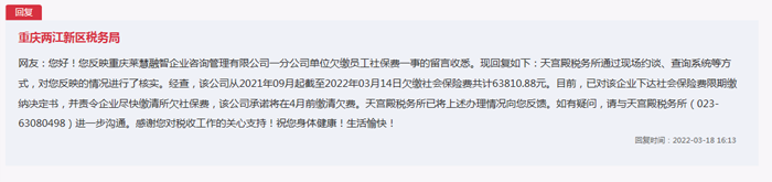針對網(wǎng)友的留言,重慶兩江新區(qū)稅務(wù)局回復(fù)稱:兩江新區(qū)天宮殿稅務(wù)所通過現(xiàn)場約談、查詢系統(tǒng)等方式,對網(wǎng)友反映的情況進(jìn)行了核實(shí)。經(jīng)查,該公司從2021年09月起截至2022年03月14日,欠繳社會保險(xiǎn)費(fèi)共計(jì)63810.88元。