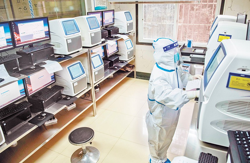 3月26日,市人民醫(yī)院檢驗(yàn)科,工作人員將加樣后的核酸上機(jī)檢測(cè)。記者 崔力 攝/視覺重慶