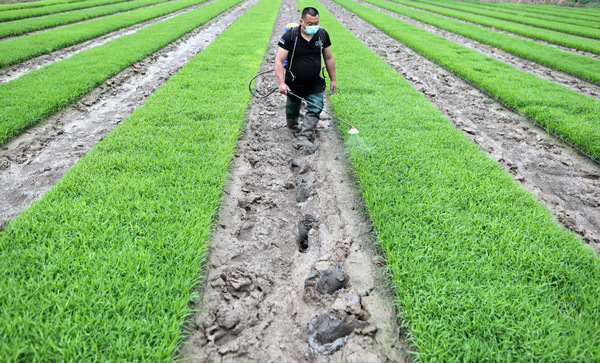 李剛在水稻田里對秧苗移栽前噴施一次農(nóng)藥。陳仕川攝