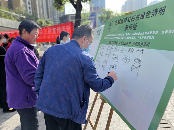 活動現(xiàn)場,天竺路社區(qū)黨委書記程朝福宣讀了“文明祭祀·綠色清明”倡議書,號召轄區(qū)黨員群眾要做文明祭祀的宣傳者、踐行者和監(jiān)督者,通過在“承諾墻”上簽字承諾、“懷念墻”上哀思寄語,引導(dǎo)大家以敬獻鮮花、植樹綠化、經(jīng)典誦讀、網(wǎng)絡(luò)祭奠等低碳環(huán)保的方式開展祭祀活動,主動摒棄不文明的祭祀行為。
