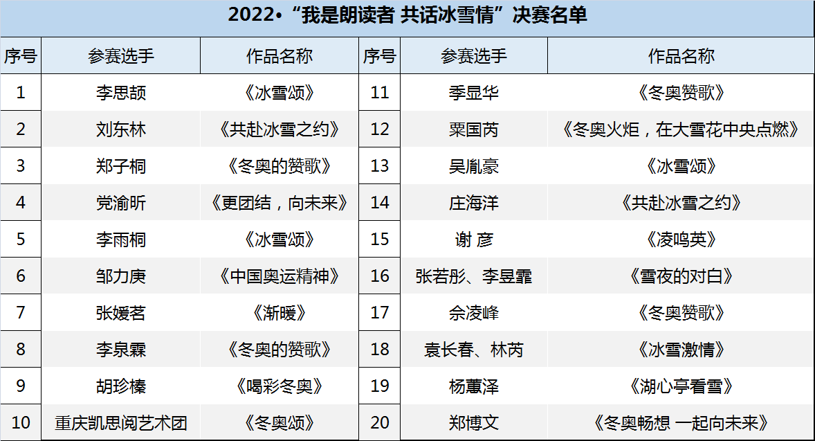 “我是朗讀者 共話冰雪情”朗讀活動決賽名單,以上排名不分先后。