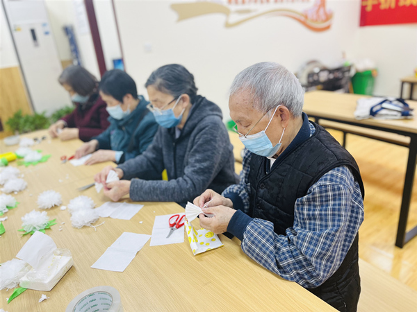 “在清明祭掃時,用紙花代替燒紙錢,以文明的方式緬懷先人,顯得更有意義,大家參與度也很高!比郊覊紊鐓^(qū)黨員志愿者表示道;顒映跏迹驹刚邆兿蜷L者了介紹手工紙花制作的步驟,然后將制作紙花的材料和工具發(fā)放給大家。在細(xì)心的指導(dǎo)示范下,長者們專心致志的制作起手工花,剪裁、粘貼、擰捏,在大家的努力下,盛開的花朵在她們手中悄然綻放,思念也深深地根植于心……
