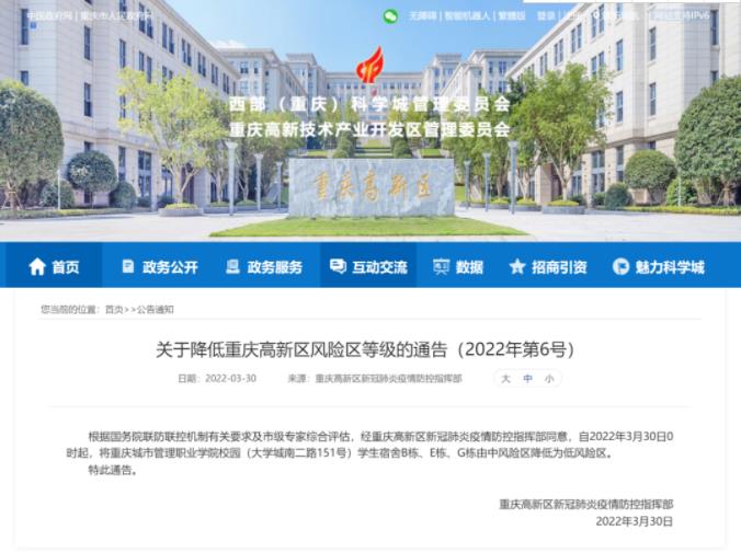 根據(jù)國(guó)務(wù)院聯(lián)防聯(lián)控機(jī)制有關(guān)要求及市級(jí)專家綜合評(píng)估,經(jīng)重慶高新區(qū)新冠肺炎疫情防控指揮部同意,自2022年3月30日0時(shí)起,將重慶城市管理職業(yè)學(xué)院校園(大學(xué)城南二路151號(hào))學(xué)生宿舍B棟、E棟、G棟由中風(fēng)險(xiǎn)區(qū)降低為低風(fēng)險(xiǎn)區(qū)。
