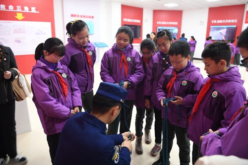 江北區(qū)消防員向學生教授消防結繩法。當?shù)叵拦﹫D 華龍網(wǎng)-新重慶客戶端 發(fā)