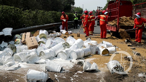 3月11日,在成渝高速璧山往永川方向,一輛滿載涂料的貨車側翻,上百桶涂料灑了出來。由于現(xiàn)場氣味刺鼻,而且隨時有起火的危險,經(jīng)過消防救援人員2個小時的處置,才化解險情。