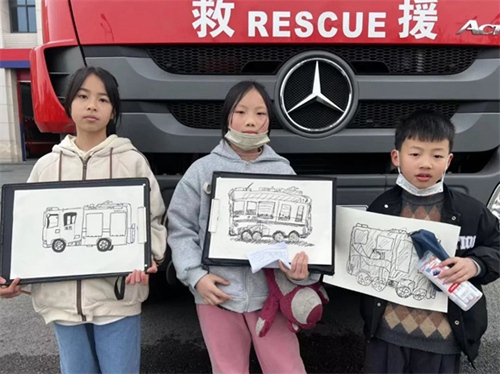 參觀體驗結束后,消防救援人員為每一個孩子送上了印制有消防元素的鑰匙扣、筆記本。孩子們也紛紛拿起畫板、畫筆,畫出了自己心中的消防車、消防員。為了感謝消防救援人員的付出和守護,小朋友們也紛紛獻上了自己的畫作,讓消防員感到無比的親切和感動。
