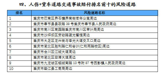 《重慶市2021年度道路交通事故保險理賠風險路段》報告中,人傷+貨車道路交通事故賠付排名前十的風險道路。重慶市保險行業(yè)協(xié)會供圖