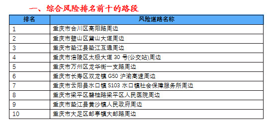 《重慶市2021年度道路交通事故保險理賠風險路段》報告中,綜合風險排名前十的路段。重慶市保險行業(yè)協(xié)會供圖