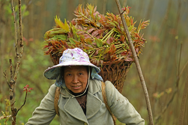 村民正在用背簍運(yùn)送香椿芽。趙勇攝