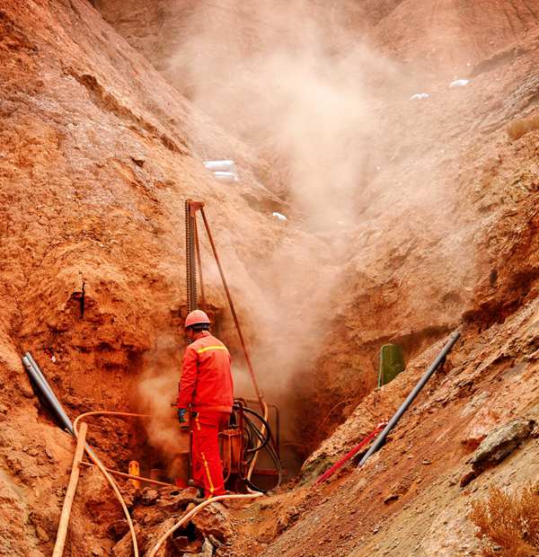 從遠處望去,沖溝內一條條羊腸小道,沿著山體蜿蜒而上,只有一腳掌寬的盤山路,被鉆工們來回搬遷設備踩踏得緊實泛白,像是給山體系上了一根白色的細腰帶,在陽光下耀眼生輝。
