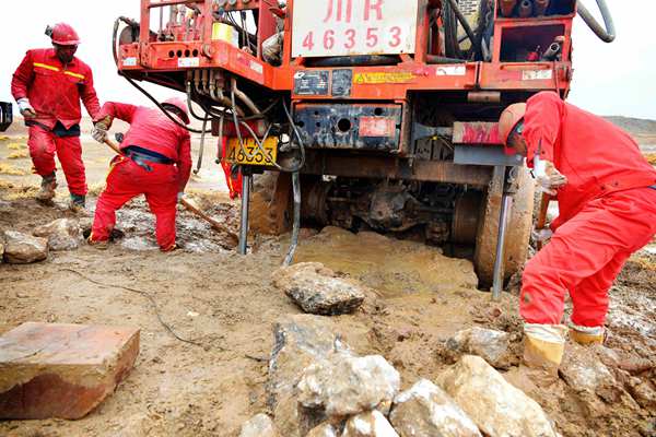 同一時間段在位于項目南段的 121、129、136 線,井位地層結構都是鵝卵石夾層,每天8個多小時只能完成一口井,20多米打下去常?ㄣ@,造成山地鉆機故障率增高。鉆井組長唐建每天都泡在機場:“難呀,戈壁灘上河道里也是砂石夾鵝卵石,地表下情況不明,有些井位要打到50多米,有的地形一尺之下就見水,容易造成塌井,產生廢井!