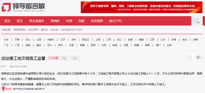 - 網(wǎng)友留言。人民網(wǎng)領(lǐng)導(dǎo)留言板截圖 人民網(wǎng)重慶4月13日電 (陳琦)“我們小區(qū)與附近道路工程工地距離只有十幾米,工地每天從早上七點施工到晚上十一二點,噪音、灰塵極大,嚴重影響居民生活和休息!