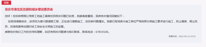 收到網(wǎng)友留言后,重慶市渝北區(qū)住房和城鄉(xiāng)建設(shè)委員會高度重視,立即安排工作人員前往工地現(xiàn)場進行核查。