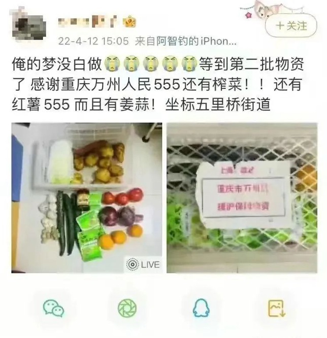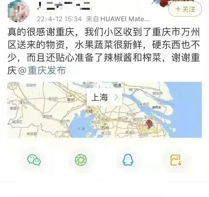 網(wǎng)友2:今天真的很感謝重慶,我們小區(qū)收到了重慶市萬州區(qū)送來的物資,水果蔬菜很新鮮,硬東西也不少,而且還貼心準備了辣椒醬和榨菜,謝謝重慶。
