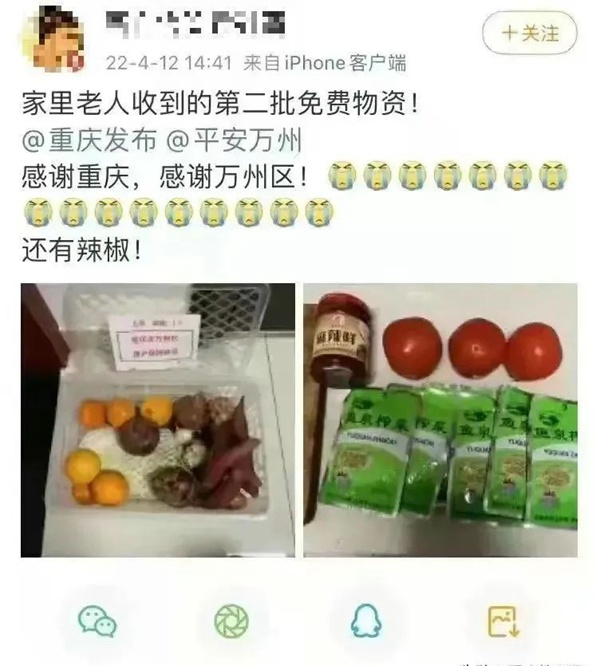 網(wǎng)友1:家里老人收到的第二批免費物資!感謝重慶,感謝萬州區(qū)!