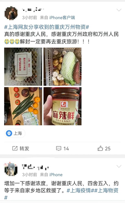 上海網(wǎng)友感謝萬州捐贈物資微博部分截圖。