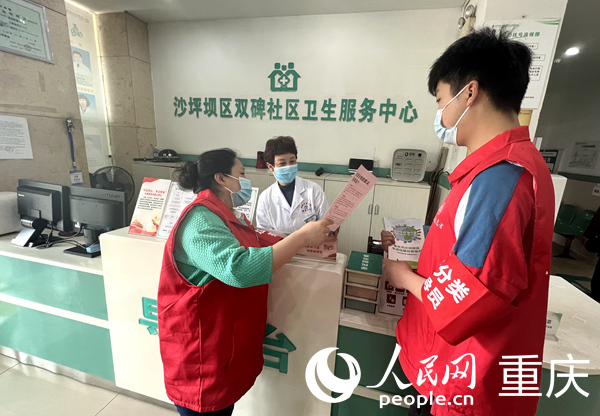 雙碑街道垃圾分類指導(dǎo)員為雙碑社區(qū)衛(wèi)生服務(wù)中心醫(yī)護(hù)人員發(fā)放宣傳手冊(cè)。人民網(wǎng) 胡虹攝