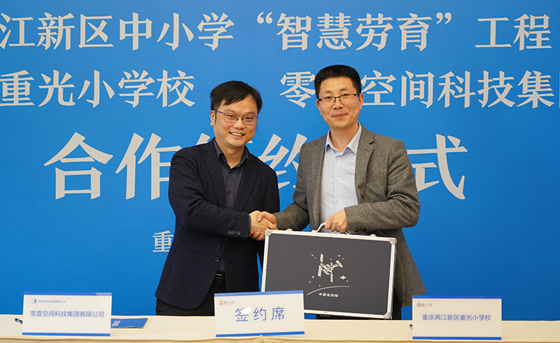 活動(dòng)中,重光小學(xué)校長李斌、重慶零壹空間副總裁陳江瀾簽署結(jié)對(duì)合作協(xié)議,重慶零壹空間贈(zèng)予重光小學(xué)太空空間站模型。