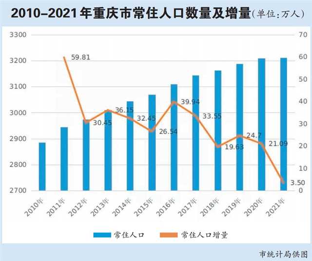 2021年,重慶人口發(fā)生了哪些變化?4月14日,市統(tǒng)計(jì)局對(duì)2021年全市人口變動(dòng)抽樣調(diào)查數(shù)據(jù)進(jìn)行解讀稱,2021年全市常住人口為3212.43萬(wàn)人,與2020年相比,常住人口增加了3.5萬(wàn)人,連續(xù)17年保持增勢(shì)。