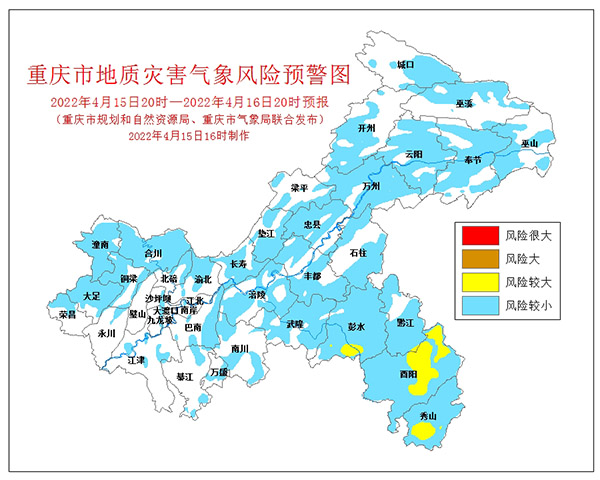 4月15日16時(shí),重慶市規(guī)劃和自然資源局、重慶市氣象局聯(lián)合發(fā)布全市地質(zhì)災(zāi)害氣象風(fēng)險(xiǎn)預(yù)警。