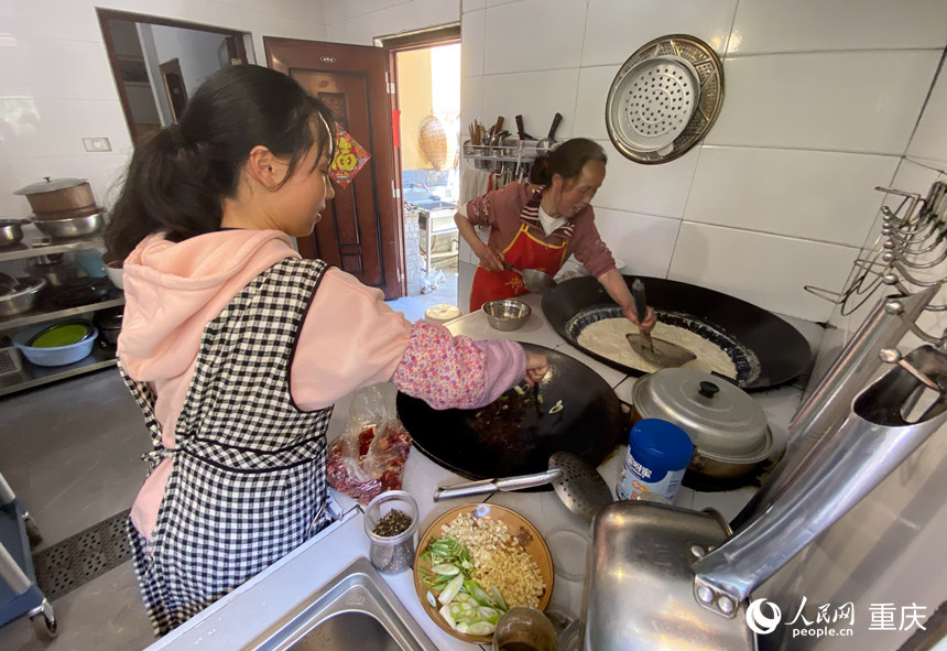 花仁叔(右)和女兒在廚房為客人準備午餐。人民網(wǎng) 劉政寧攝
