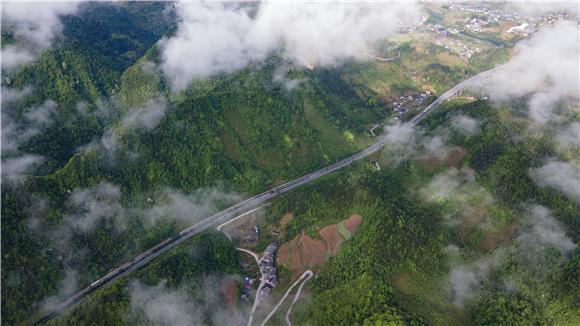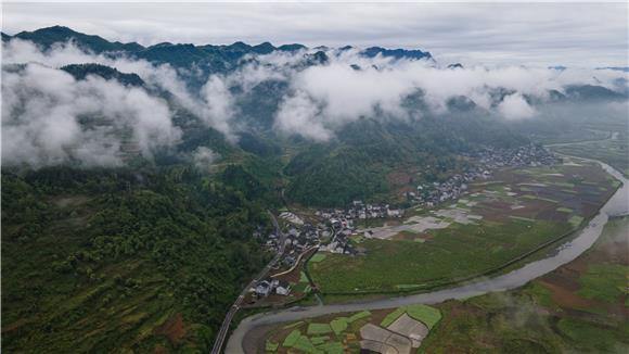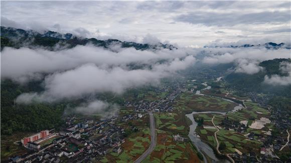近日清晨,驟雨初歇,重慶市秀縣溶溪境內(nèi)山間云霧繚繞,在云霧掩映下的民居、田園、河流、公路若隱若現(xiàn)宛如仙境,構(gòu)建出一幅幅美麗的春景畫面。