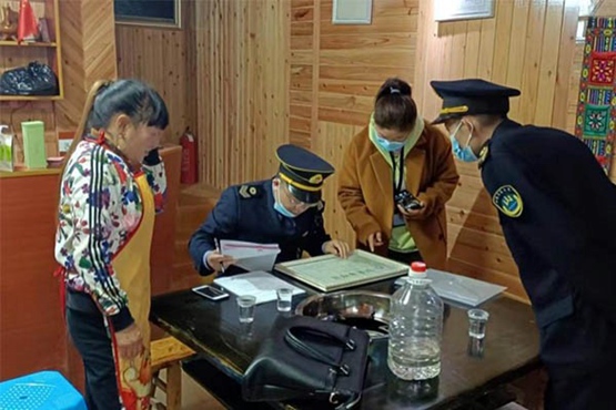 執(zhí)法人員檢查公共場所衛(wèi)生許可證持有情況。石柱縣衛(wèi)生健康綜合行政執(zhí)法支隊(duì)供圖