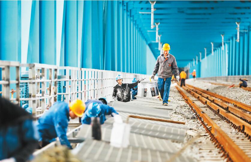 四月十五日,鐵路樞紐東環(huán)線明月峽長江大橋,工人正在安裝護(hù)軌和防拋網(wǎng)。記者 羅斌 攝\視覺重慶