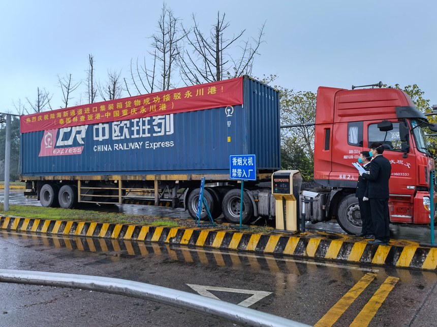 永川海關(guān)與渝州海關(guān)助力西部陸海新通道進(jìn)口集裝箱成功接駁永川港慶。重慶海關(guān)供圖