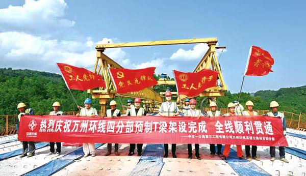 “項(xiàng)目全線30米長(zhǎng)、40米長(zhǎng)的T梁共有3020片,總重量超過(guò)2萬(wàn)多噸,可以說(shuō)全線很大一部分路線是由一片片T梁鋪裝連接而成的!庇瓉(lái)建設(shè)期內(nèi)的又一個(gè)重大節(jié)點(diǎn),中交一公局萬(wàn)州公司黨總支書記、總經(jīng)理晁元昭信心滿滿。隨著橋梁橋面系、護(hù)欄澆筑附屬工程及主線水穩(wěn)層、瀝青層攤鋪等重點(diǎn)工序的同步有序展開、縱深一體推進(jìn),萬(wàn)州環(huán)線高速公路建設(shè)目前已進(jìn)入全面沖刺階段。