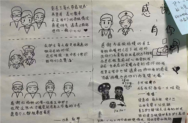 重慶市中醫(yī)院肛腸科“互動墻”上,患者手繪的感謝信。受訪者供圖