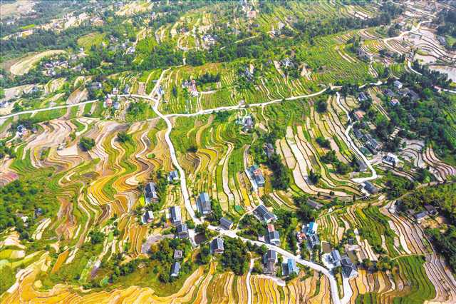 4月23日,綦江區(qū)郭扶鎮(zhèn)古松村,梯田、村莊、產(chǎn)業(yè)路繪就一幅美麗田園畫。