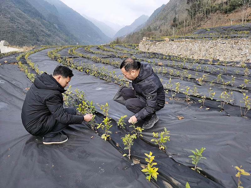 駐村第一書記查看茶樹苗生長(zhǎng)情況。民生銀行重慶分行供圖