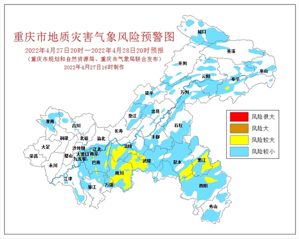 4月27日16時,重慶市規(guī)劃和自然資源局、重慶市氣象局聯(lián)合發(fā)布全市地質(zhì)災(zāi)害氣象風(fēng)險預(yù)警。