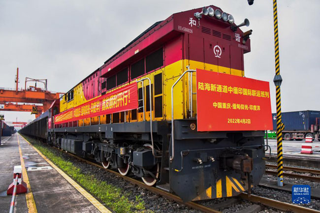 4月2日,陸海新通道中緬印國際聯(lián)運(yùn)班列(重慶-仰光-印度洋)在重慶鐵路集裝箱中心站首發(fā),這是陸海新通道首次開辟直通印度洋的新線路。新華社發(fā)(潘婕攝)