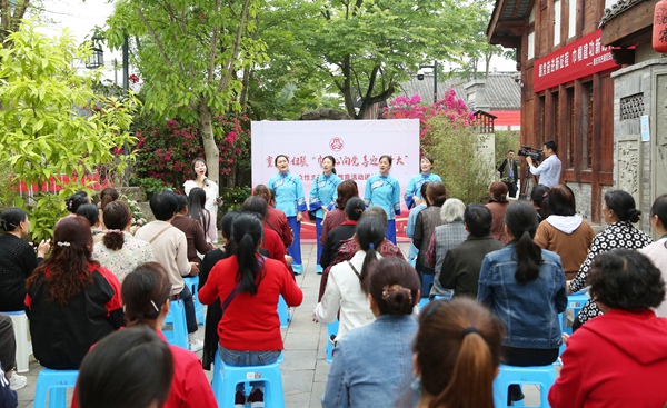 4月29日,在重慶市巴南區(qū)木洞鎮(zhèn)河街廣場,傳來了陣陣木洞山歌聲,重慶市婦聯(lián)舉辦的“巾幗心向黨 喜迎二十大”群眾性主題宣傳教育進社區(qū)活動正在開展。