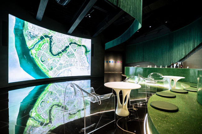 展館內(nèi),高清投影、VR演示和動效視頻,展現(xiàn)麓溪湖片區(qū)產(chǎn)城景融合的規(guī)劃理念和兩江新區(qū)“一半山水一半城”的美麗圖景,以及麓溪湖水生態(tài)治理、麓溪湖山水城市示范區(qū)規(guī)劃。麓溪湖將會采用水生態(tài)調(diào)節(jié)系統(tǒng)工程的形式,遵循“調(diào)節(jié)、營建、管養(yǎng)”的科學(xué)治理步驟,最終將形成約30萬方開闊水域,成為該區(qū)域核心景觀資源。