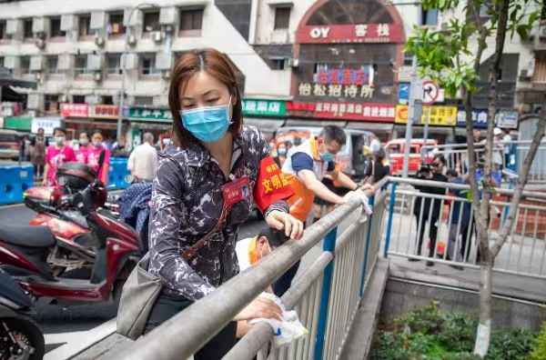 志愿者對圍欄進(jìn)行清潔。楊家坪街道供圖