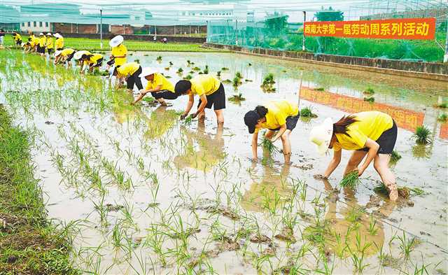 4月27日,西南大學(xué)農(nóng)學(xué)與生物科技學(xué)院35名學(xué)生,來到位于北碚歇馬的西南大學(xué)水稻研究所實驗基地,開展“學(xué)習(xí)隆平精神 躬耕田野實踐”水稻插秧生產(chǎn)勞動實踐活動。田間地頭的勞作讓學(xué)生們更加懂得“絕知此事要躬行”的道理。該校農(nóng)學(xué)與生物科技學(xué)院黨委書記陽義健介紹,在不同的季節(jié)學(xué)院會安排學(xué)生參加不同的田間勞動課程和活動,包括水稻、油菜、薯類、玉米、小麥的栽培和管理等。通過這些生產(chǎn)實踐活動,幫助學(xué)生樹立正確的勞動價值觀,鍛煉他們的勞動技能。