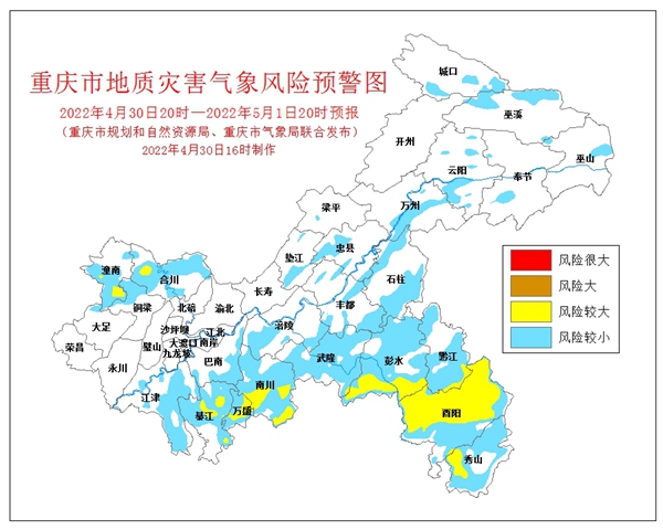 4月30日16時,重慶市規(guī)劃和自然資源局、重慶市氣象局聯(lián)合發(fā)布全市地質(zhì)災(zāi)害氣象風(fēng)險預(yù)警。