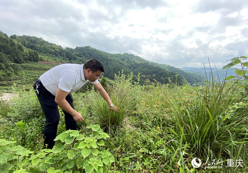 余思成在查看香根草長(zhǎng)勢(shì)。人民網(wǎng) 劉政寧攝