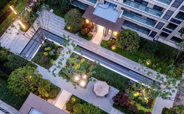 由于地形高差原因,招商雍璟城·璟閣洋房區(qū)分為三個臺地,整體建筑依照地勢有序排列,呈層層退臺式布局,由此形成的對景景墻、空中棧橋等景觀元素掩映在綠影斑駁間,空間層次感十分豐富。