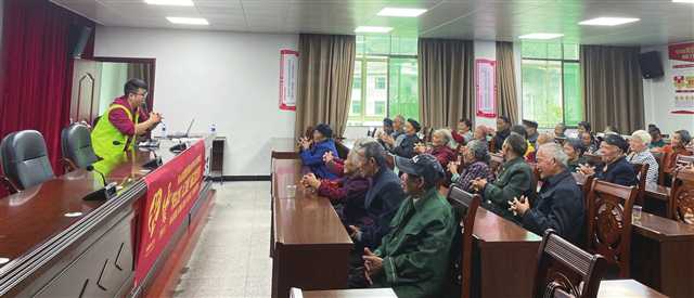 孟曉軻在健康主題社區(qū)活動中帶領(lǐng)老人們學(xué)習(xí)養(yǎng)生手指操